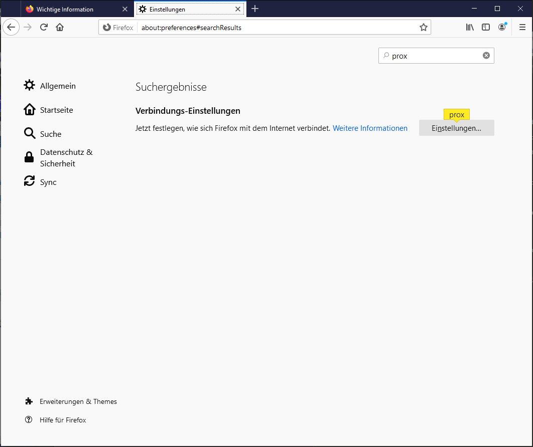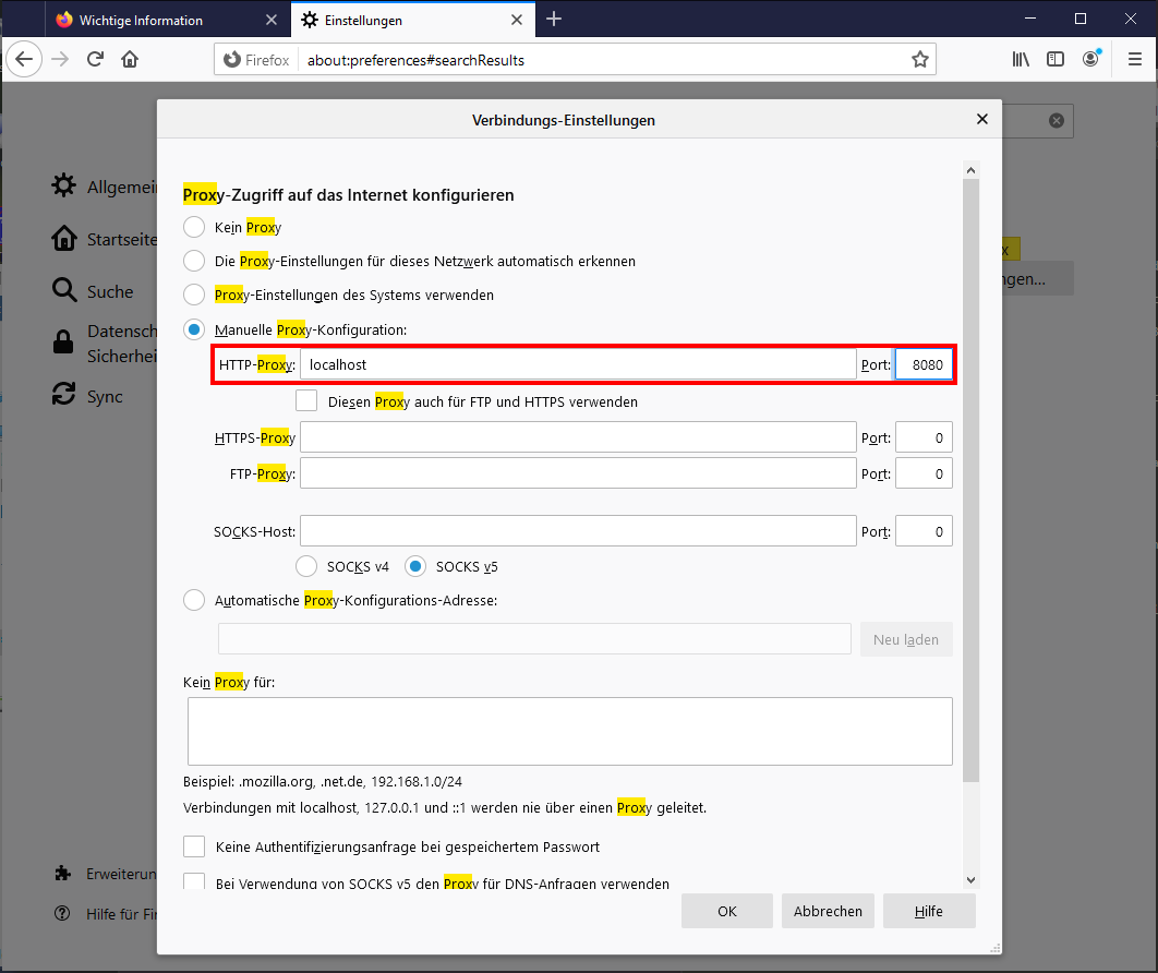 Die einfachste möglichkeit ist den Webbrowser über den Proxy laufen zu lassen, dazu in Firefox in den Einstellungen nach Proxy suchen und über den Button “Einstellungen…” öffnen