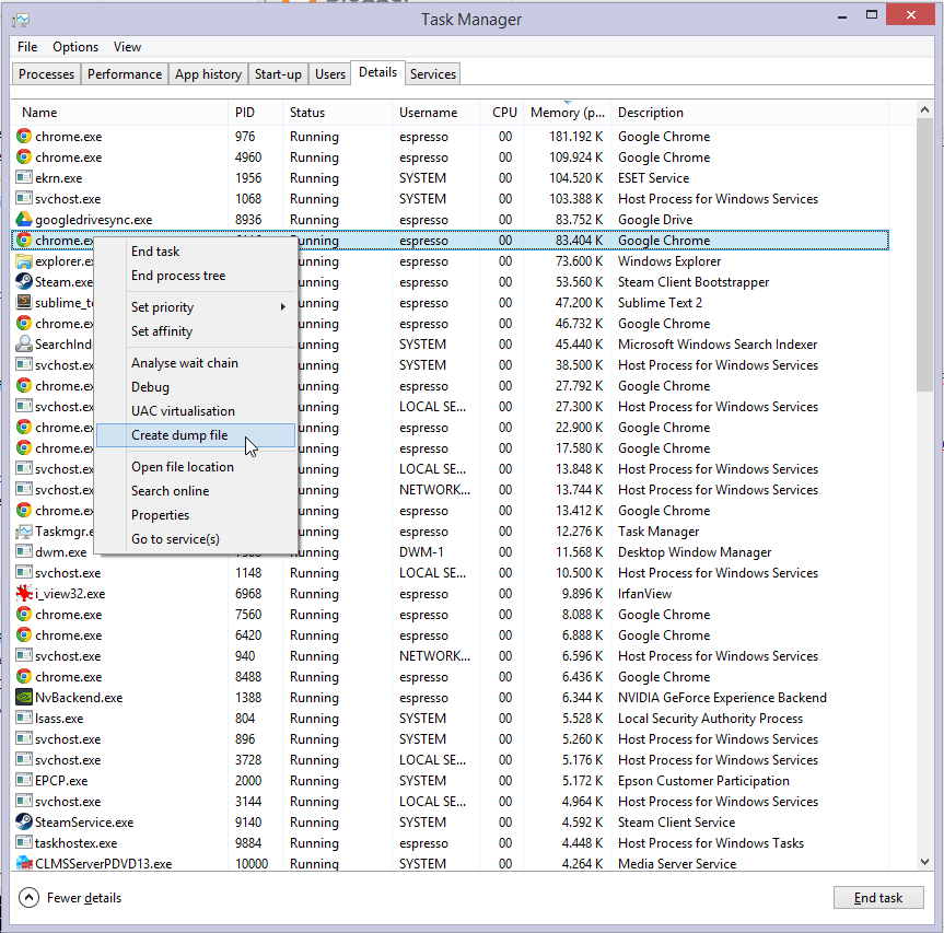 Als erstes Beispiel soll uns ein Memroy Dump des Chrome-Webbrowsers dienen. Unter Windows wird das z.B. mit dem Taskmanager erstellt: